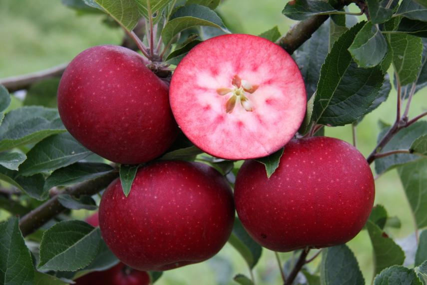 Pomme rouge à chair rosée à rouge (souvent marbrée), croquante et juteuse, très décorative en dégustation comme en jus. Maturité de fin aout à octobre selon le climat, l’altitude et l’année.