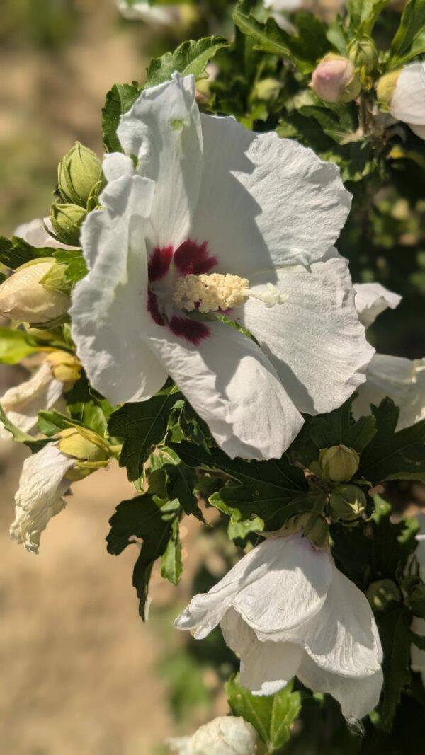 L’Hibiscus syriacus ‘Red Heart’ est une ancienne variété d’althéa, devenue un incontournable des jardins. Cet arbuste à feuillage caduc se distingue par ses grandes fleurs blanches au cœur rouge foncé, qui apparaissent du début de l’été jusqu’aux premières gelées. De taille modérée et peu vigoureuse, il nécessite une taille annuelle et se prête bien à la culture en massif fleuri ou en pot. Rustique, il s’épanouit aussi bien au soleil qu’à mi-ombre, dans des sols bien drainés, même calcaires.