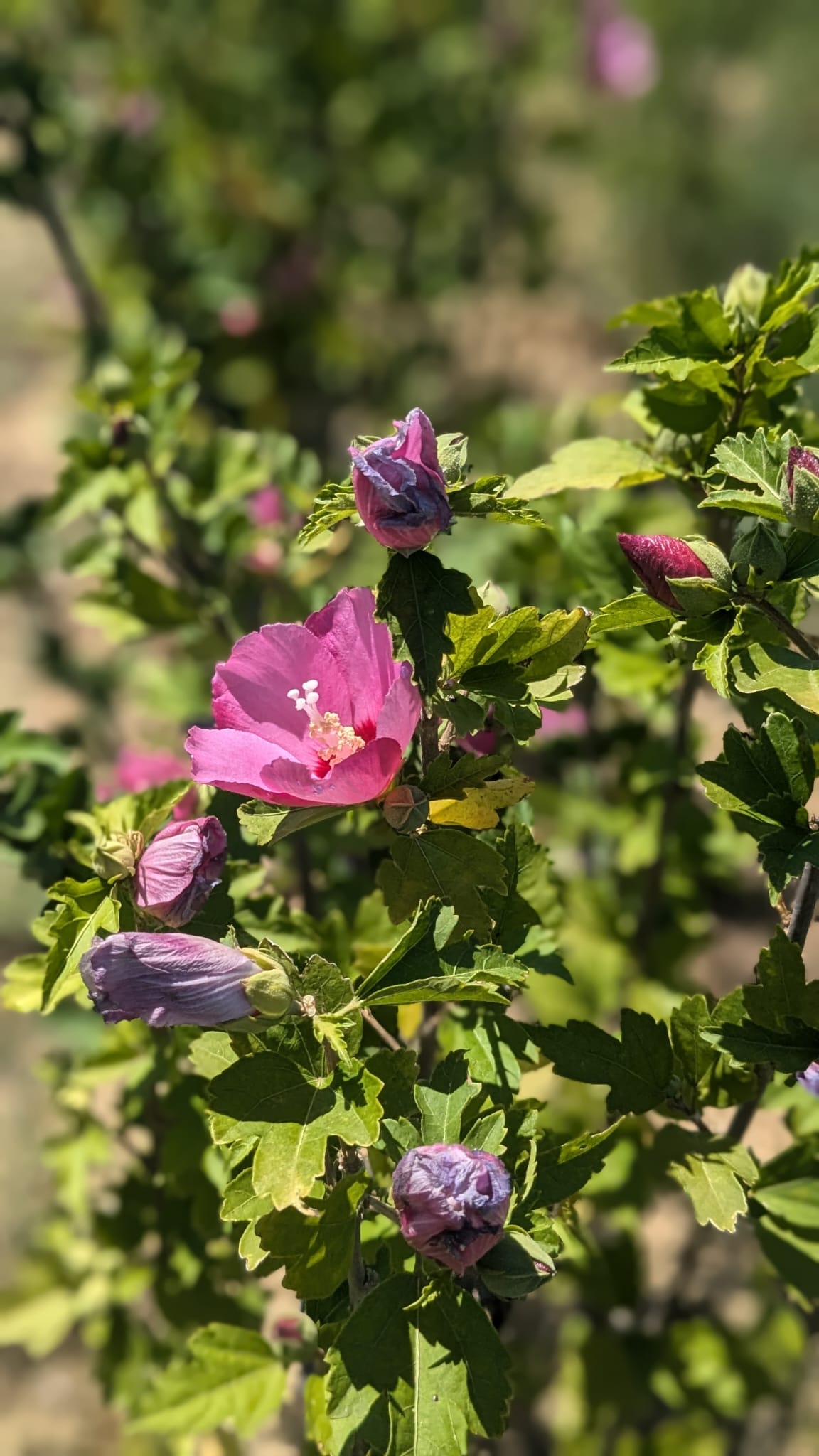 L’Hibiscus syriacus, aussi appelé Ketmie des jardins ou Mauve en arbre, est un arbuste très rustique, caduc sous nos climats, mais persistant dans les régions chaudes. Membre de la famille des Malvacées, comme les roses trémières et la guimauve, il est originaire des zones tempérées d’Asie. De nombreux cultivars ont vu le jour, dont la variété ‘Woodbridge’, qui se distingue par son port érigé et sa floraison généreuse d’août à octobre.