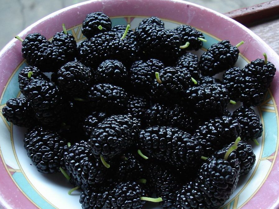 Mûrier Kim, variété vigoureuse à gros fruits noirs très savoureux avec une note marquée de mûre. Récolte estivale abondante, rustique, résistante à la sécheresse. Idéal pour jardins, haies fruitières et petits vergers. Greffé sur mûrier.
