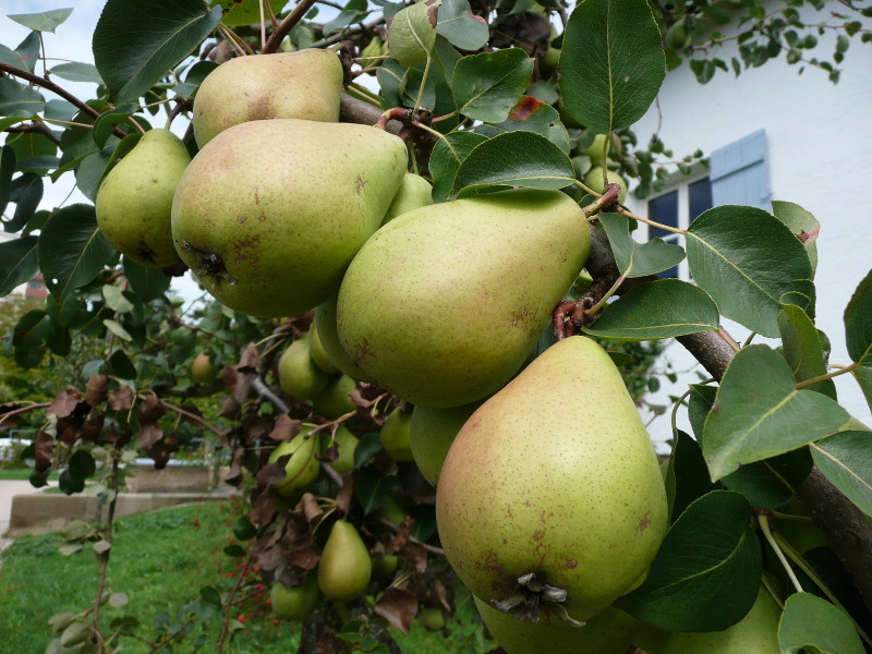 Grosse poire polyvalente, bonne à cuire et agréable à croquer après affinage. Récolte d’octobre à décembre (selon le climat, l’altitude et l’année).