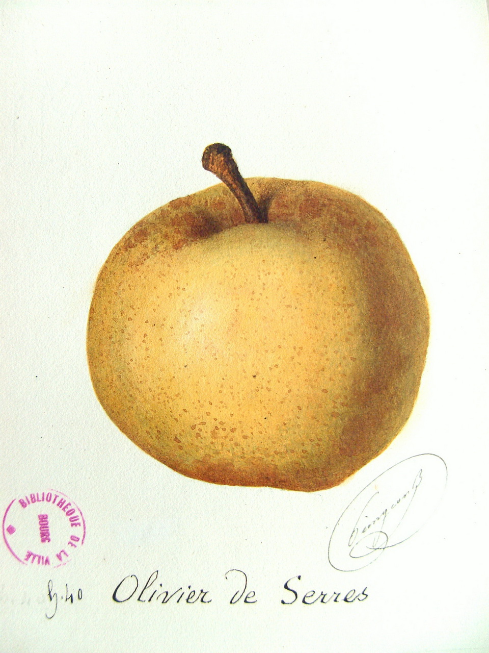 Bel arbre peu fertile. Fruit de calibre au-dessus de la moyenne, forme arrondie et aplatie. Chair blanchâtre, fondante ou demi fondante, bien sucrée, aigrelette, savoureusement parfumée.