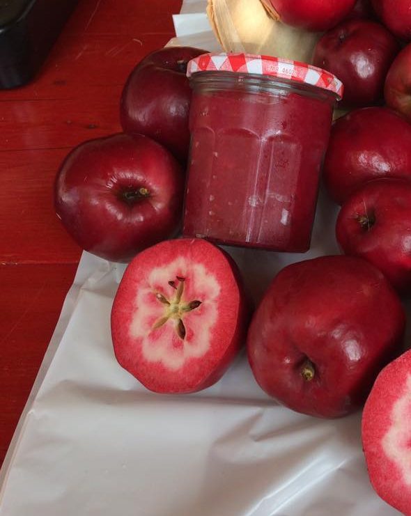 Pomme à chair rosée à rouge, acidulée, idéale en cuisine (tartes, compotes) et en jus.