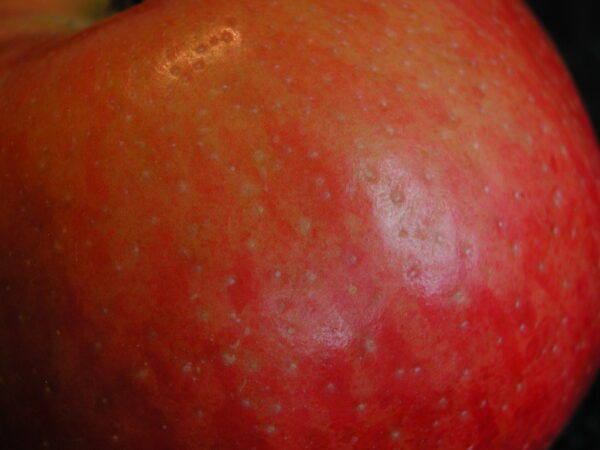 • Type de fruit : pomme jaune largement lavée/striée de rouge.