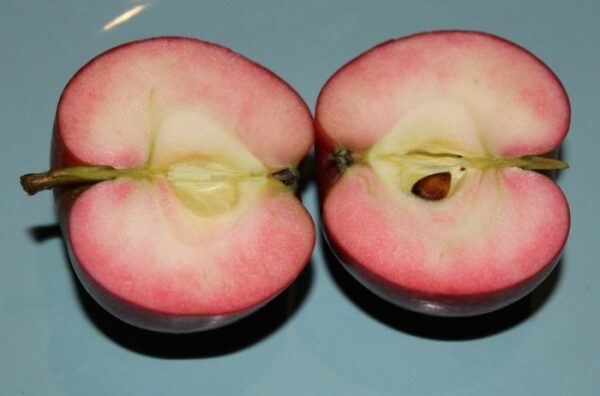 Pomme rouge au jus rosé (chair veinée de rouge), fruitée et agréable. Récolte de mi-septembre à mi-octobre selon climat/année, conservation souvent jusqu’à décembre selon stockage.
