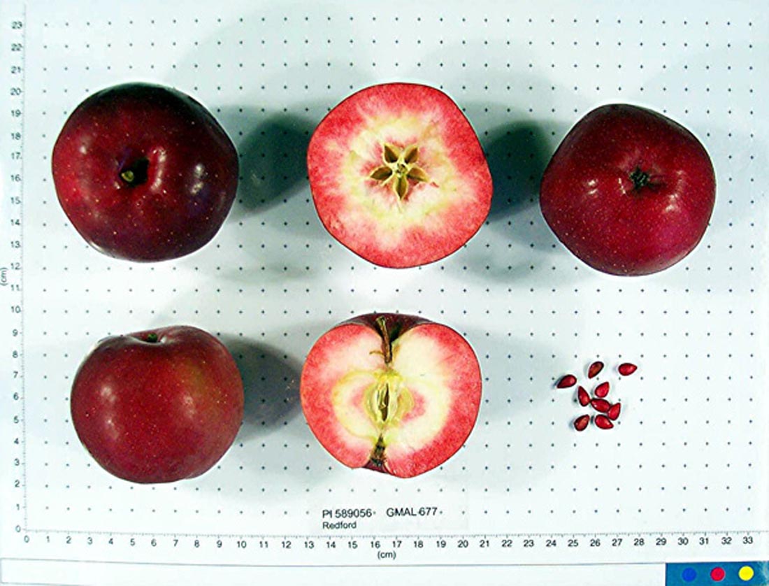 Le pommier ‘Redford’ est une variété appréciée pour ses fruits colorés, à peau rouge et à chair rosée à rouge marbrée, intéressante autant au verger familial que pour les transformations (jus, compotes, pâtisseries).